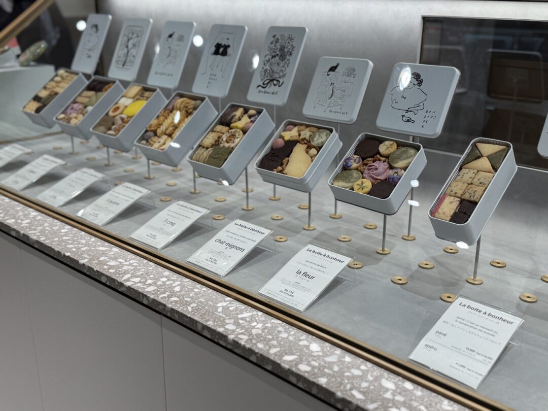 こりゃ、たまらん!と喜び勇んで早速訪れました。クッキー缶が並んでる〜っ! しかもめちゃ種類多いじゃないですか。でも常時あるのは「1 un」と「5 cinq」、そして「chat mignons」「la fleur」「La boite a bonheur(2種)」で、「2 deux」「3 trois」「4 quatre」は予約制だそうです。